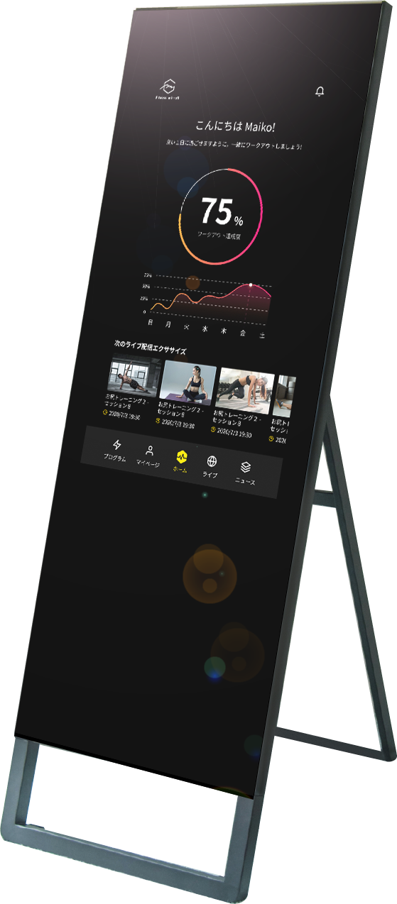フィットネスミラーとは、全身ミラーにモニターが内蔵されています。映像と自分の姿を同時に映すことで、正しい姿勢でのトレーニングが実現。新感覚のミラーリングトレーニング・エクササイズが行えます。